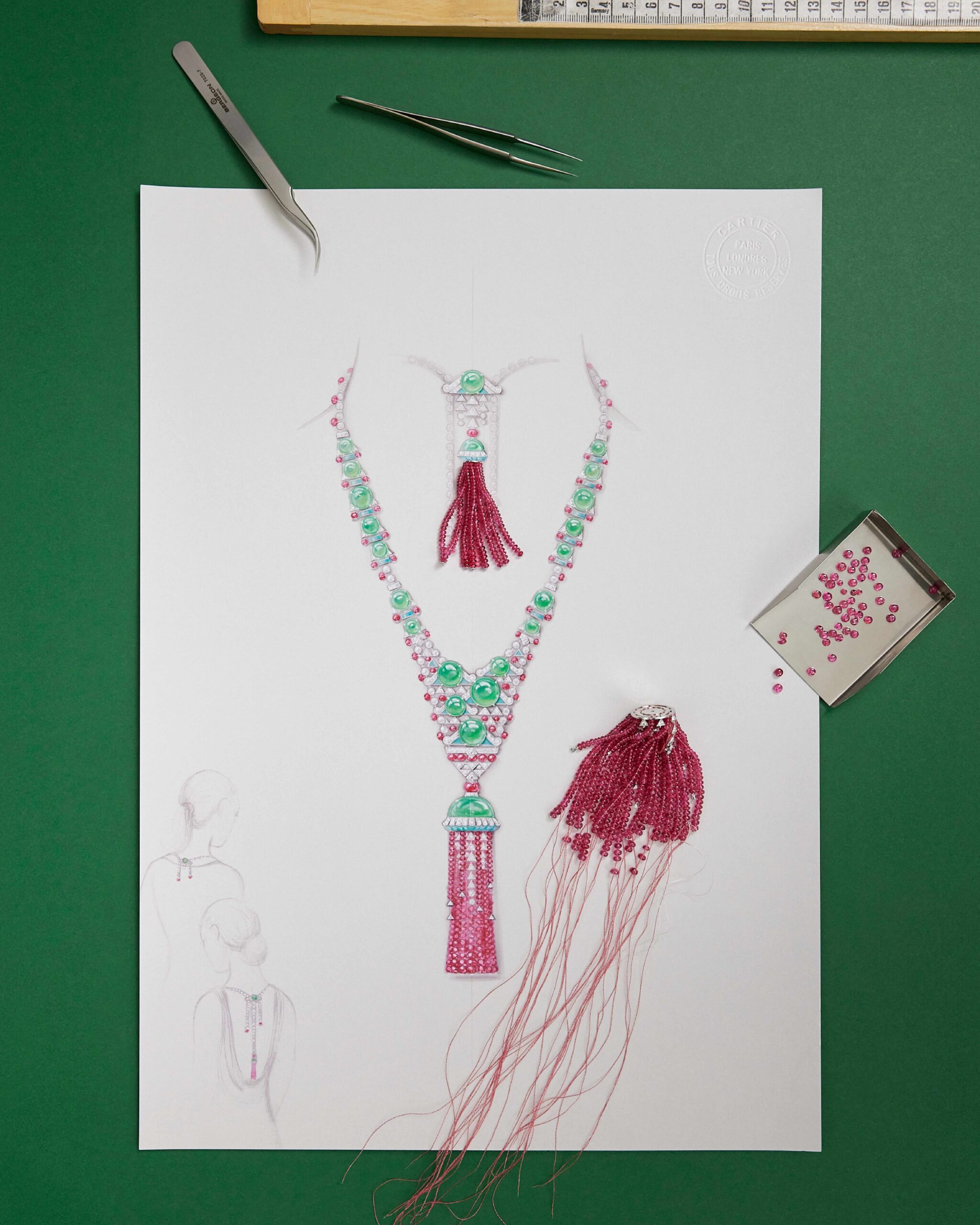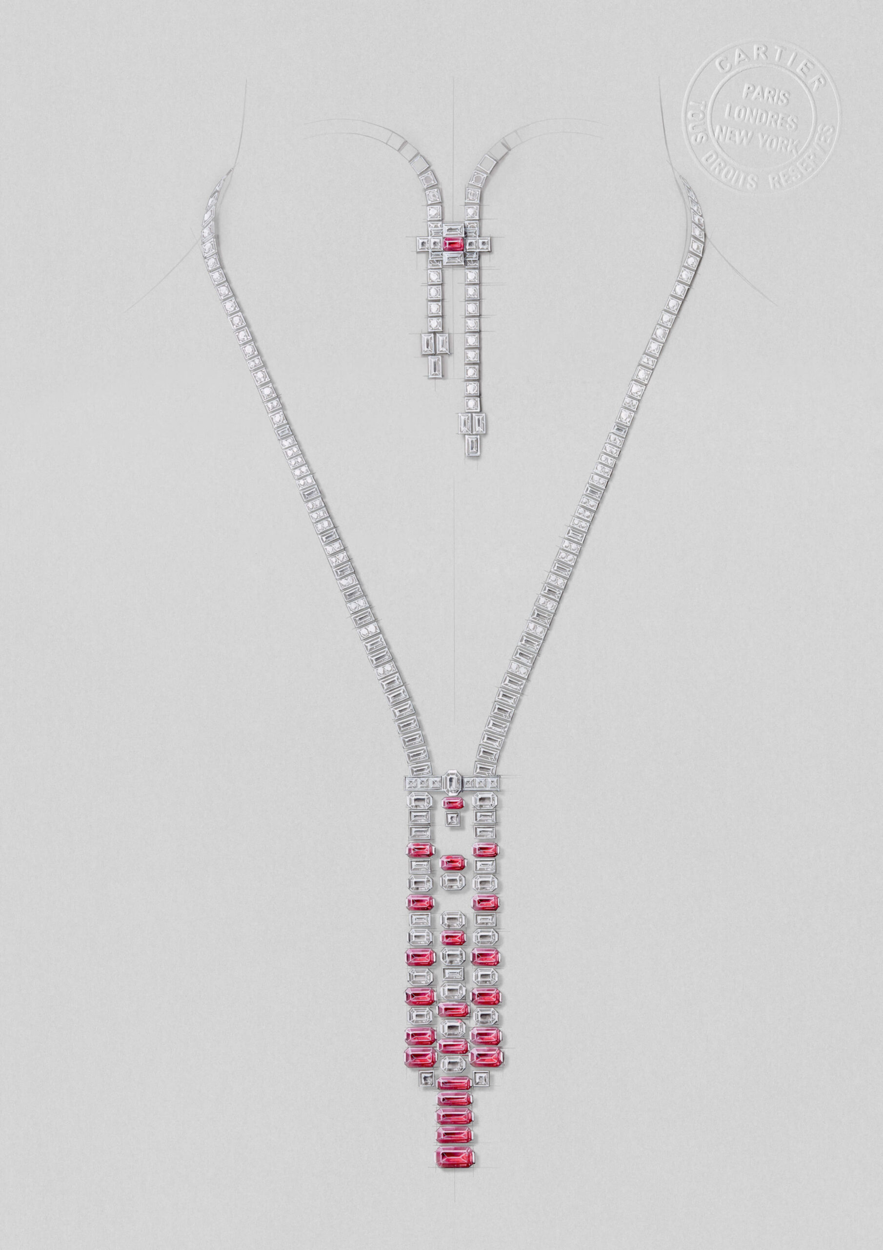 Color and distinction play a central function in Parcae and Ondora. Parcae combines platinum, sapphires and diamonds, whereas Ondora juxtaposes chrysoprase, spinels and turquoise with diamonds in each natural and geometric types. In Ondora, twin pendants — one adjustable — showcase Cartier’s mastery of transformable jewelry, echoing pure motifs such because the fluid movement of jellyfish, rendered in a structured but summary method.