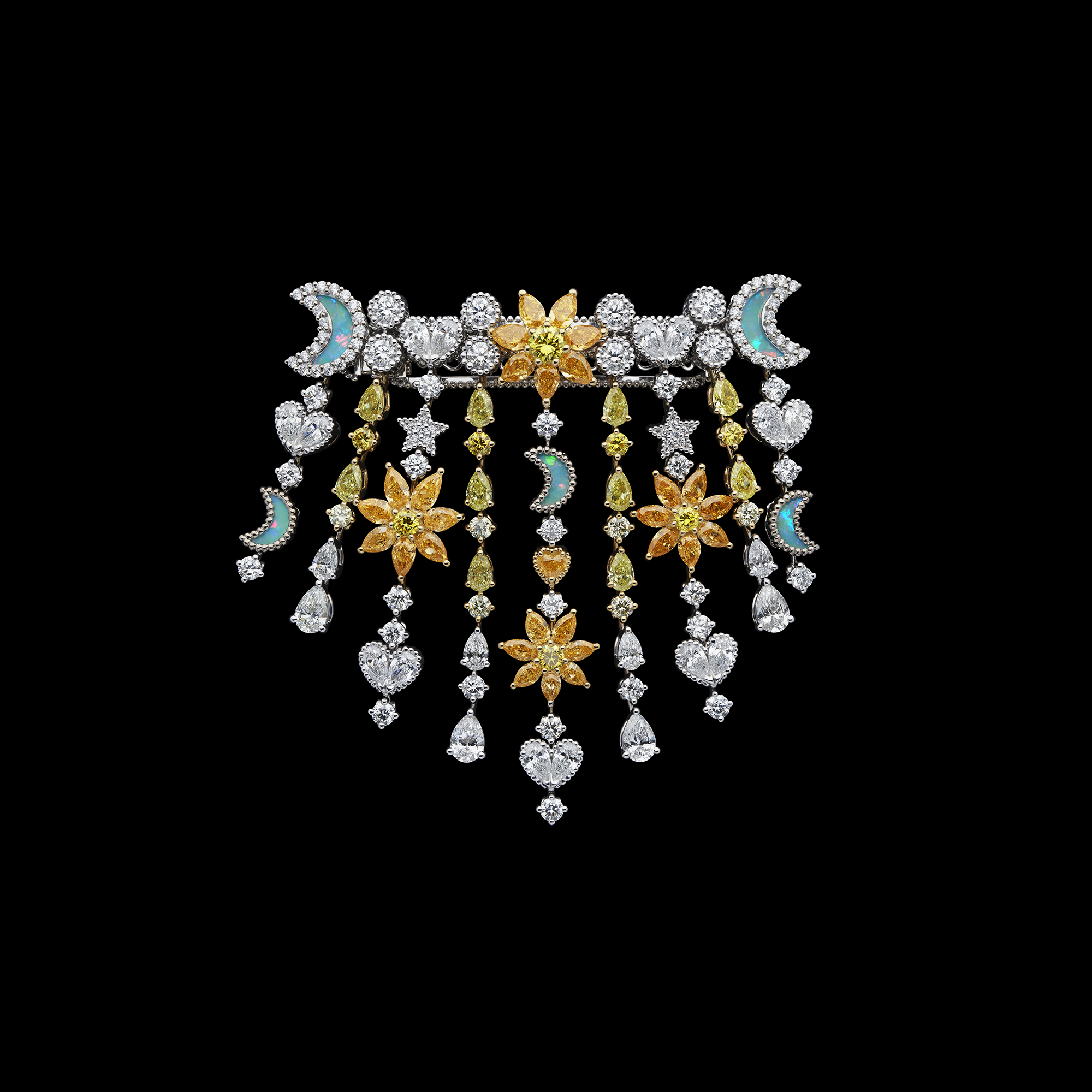 Heritage references are additional developed by means of thematic units that draw on Christian Dior’s private pursuits. The “Soleil Céleste” suite revisits the couturier’s fascination with astrology and divination, translating celestial symbolism into excessive jewelry by means of yellow diamonds and moon and star motifs carved from black opal doublets set towards turquoise. Designed to be modular, the set consists of transformable components resembling a bracelet that converts right into a choker and a brooch that may be worn as a hair decoration, underscoring the Maison’s emphasis on versatility.