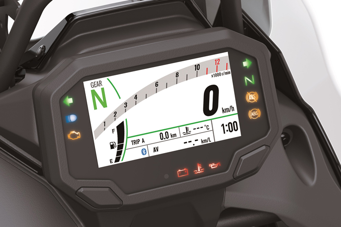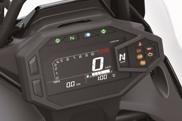 Instrumentation consists of an LCD instrument panel that connects to a smartphone by way of Rideology the App. By way of the app, riders can entry automobile data and log their routes and efficiency information within the Using Log operate. The LCD display screen additionally shows cellphone notifications, and the Economical Using Indicator flashes to let riders know when gas consumption is favorable.