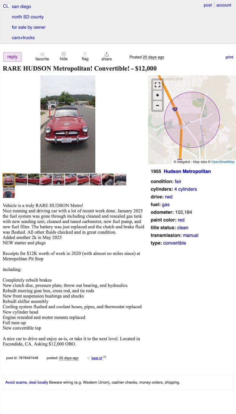 Immediately’s Good Value or No Cube Metropolitan is not the anticipated Nash version, however a far rarer Hudson-branded automotive. Whereas seemingly in fine condition and cute as a button, we’ll nonetheless must determine if its asking value reveals an unpleasant reality.