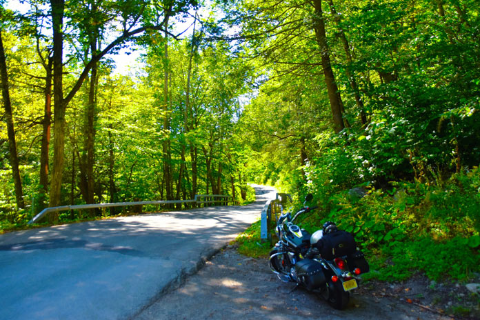 At Pine Bush, we cruised west into Shawangunk Ridge State Forest and stopped at an overlook to admire the view of the valley beneath and the Catskill Mountains. After snaking down the mountain to Ellenville, we continued to Rondout Reservoir and weaved alongside the reservoir’s forest-lined shoreline on SR-55A. On the west finish of the reservoir, we linked with SR-42, cruising into the Sunset Wild Forest and Slide Mountain Wilderness areas of Catskill Park.