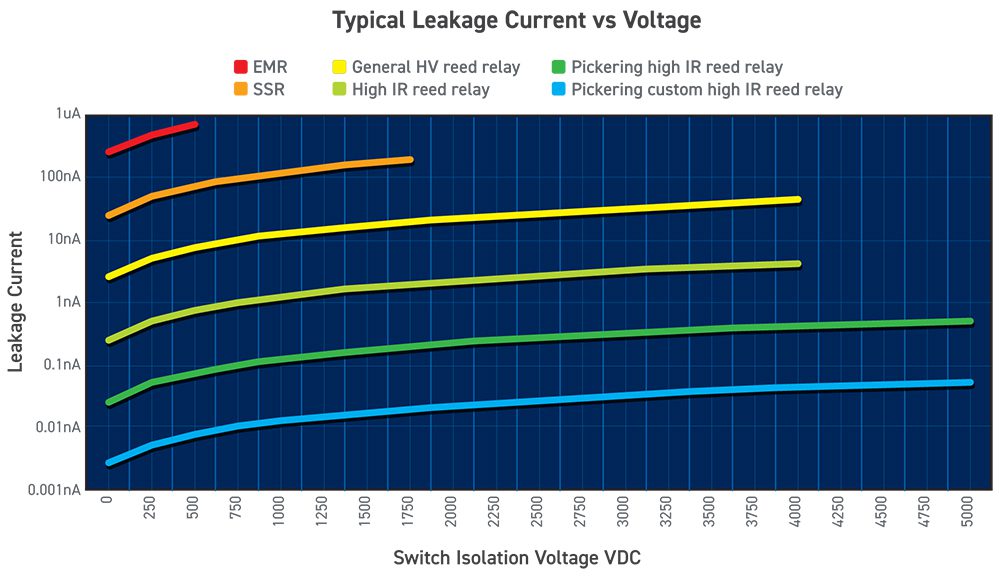 Electromechanical relays are reasonably priced however their open-air contacts restrict sensible switching voltage and standoff. Stable-state relays are quick and compact, but introduce non-linear leakage and better off-state capacitance that may masks actual leakage within the gadget below check. Excessive-voltage reed relays remedy a special set of issues. The contacts are sealed in an inert vacuum, in order that they tolerate increased electrical fields in a small package deal and ship extraordinarily low off-state leakage with very low parasitics. The coil is galvanically remoted from the sign path, which protects management electronics. Function occasions are quick, sometimes below a millisecond, which helps preserve cycle time down.