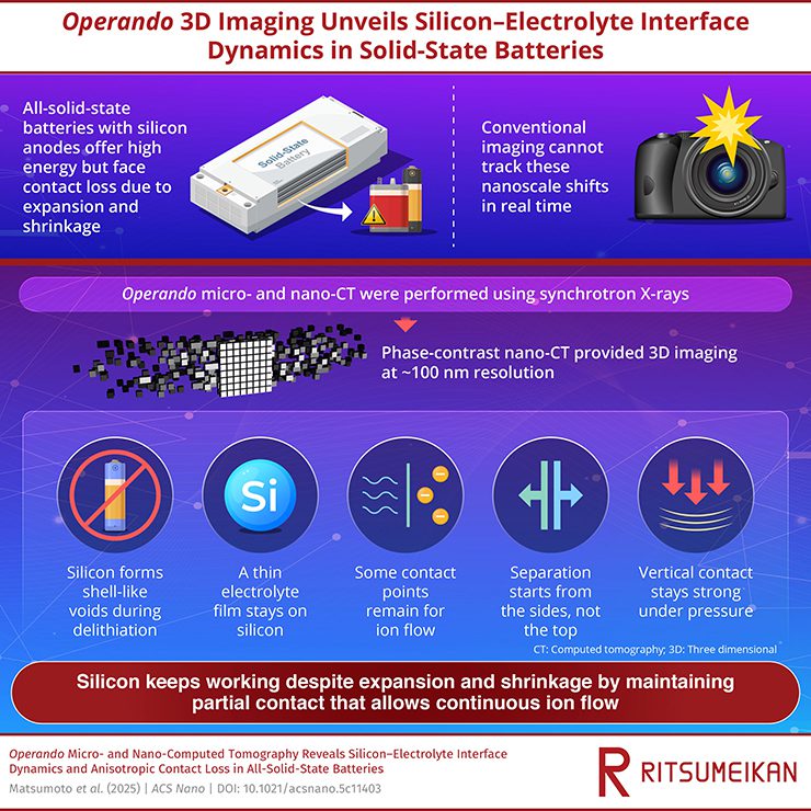 The analysis group, led by Professor Yuki Orikasa from the Faculty of Life Sciences at Ritsumeikan College, reported its findings in “Operando Micro- and Nano-Computed Tomography Reveals Silicon-Electrolyte Interface Dynamics and Anisotropic Contact Loss in All-Stable-State Batteries,” revealed within the journal ACS Nano.