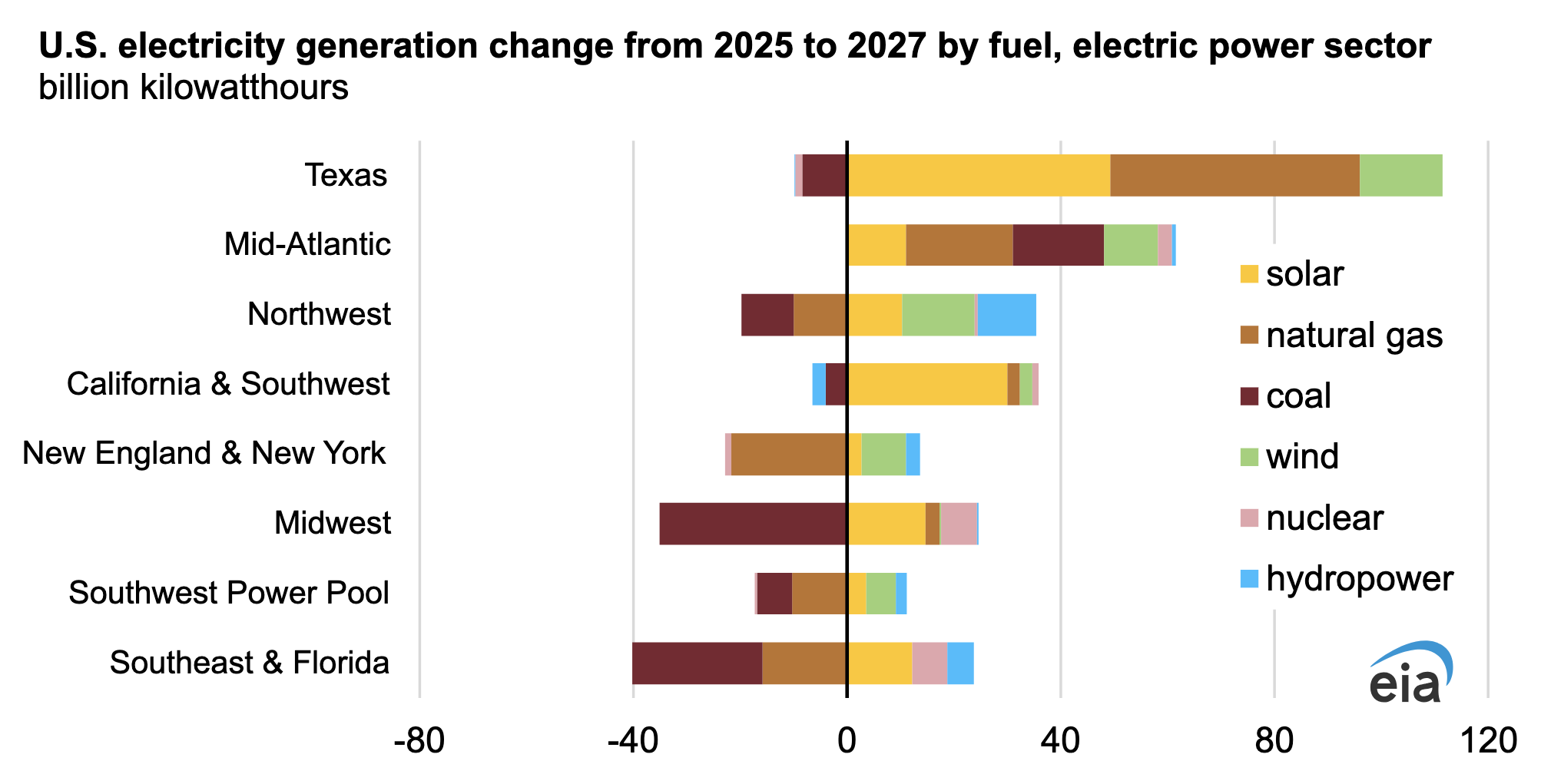 Wind era has been historically concentrated within the central a part of the nation, similar to within the grid operated within the Midwest by the Midcontinent Unbiased System Operator (MISO). Nevertheless, additions of latest wind producing capability have slowed in MISO, and we count on little progress in MISO wind era by way of 2027, averaging simply over 100 BkWh yearly. New photo voltaic plant initiatives are additionally beginning up in MISO. We count on MISO photo voltaic era to develop from 31 BkWh in 2025 to 46 BkWh in 2027.