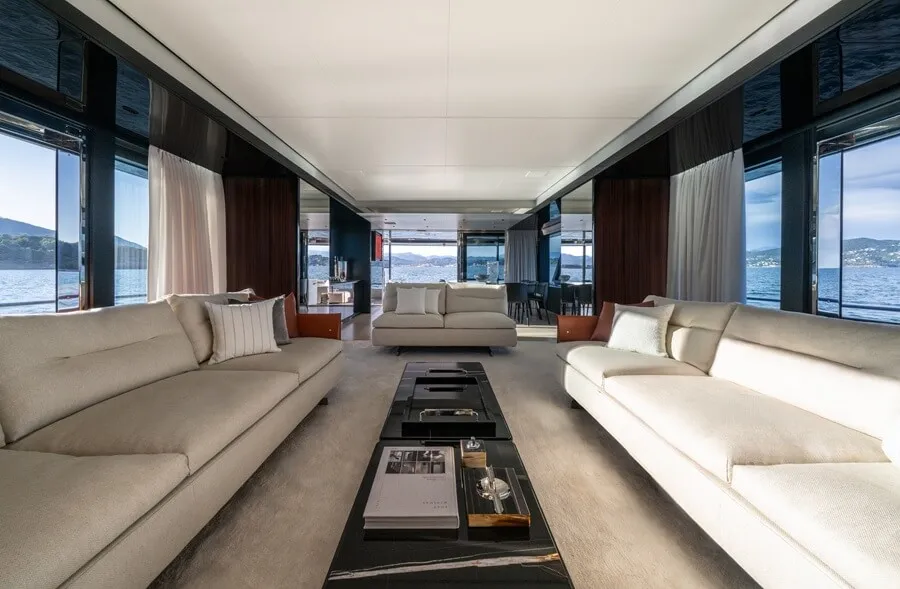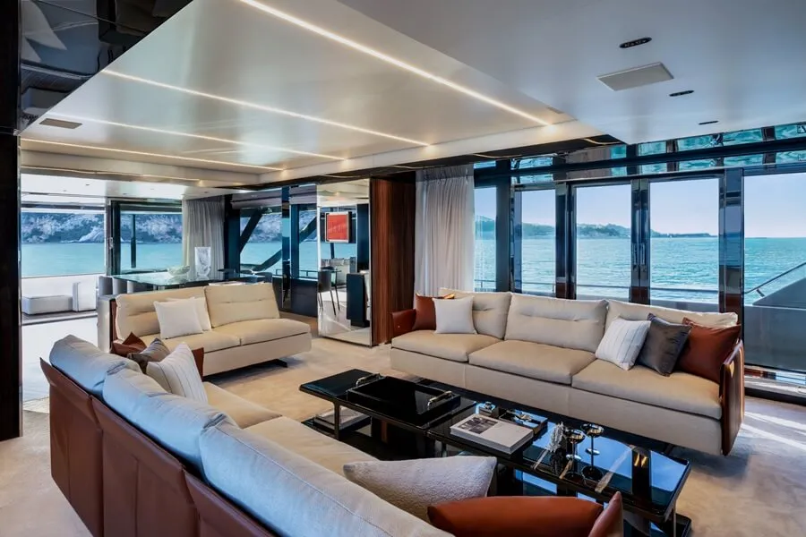 In the primary saloon, full-height glass flanks each side of the saloon.