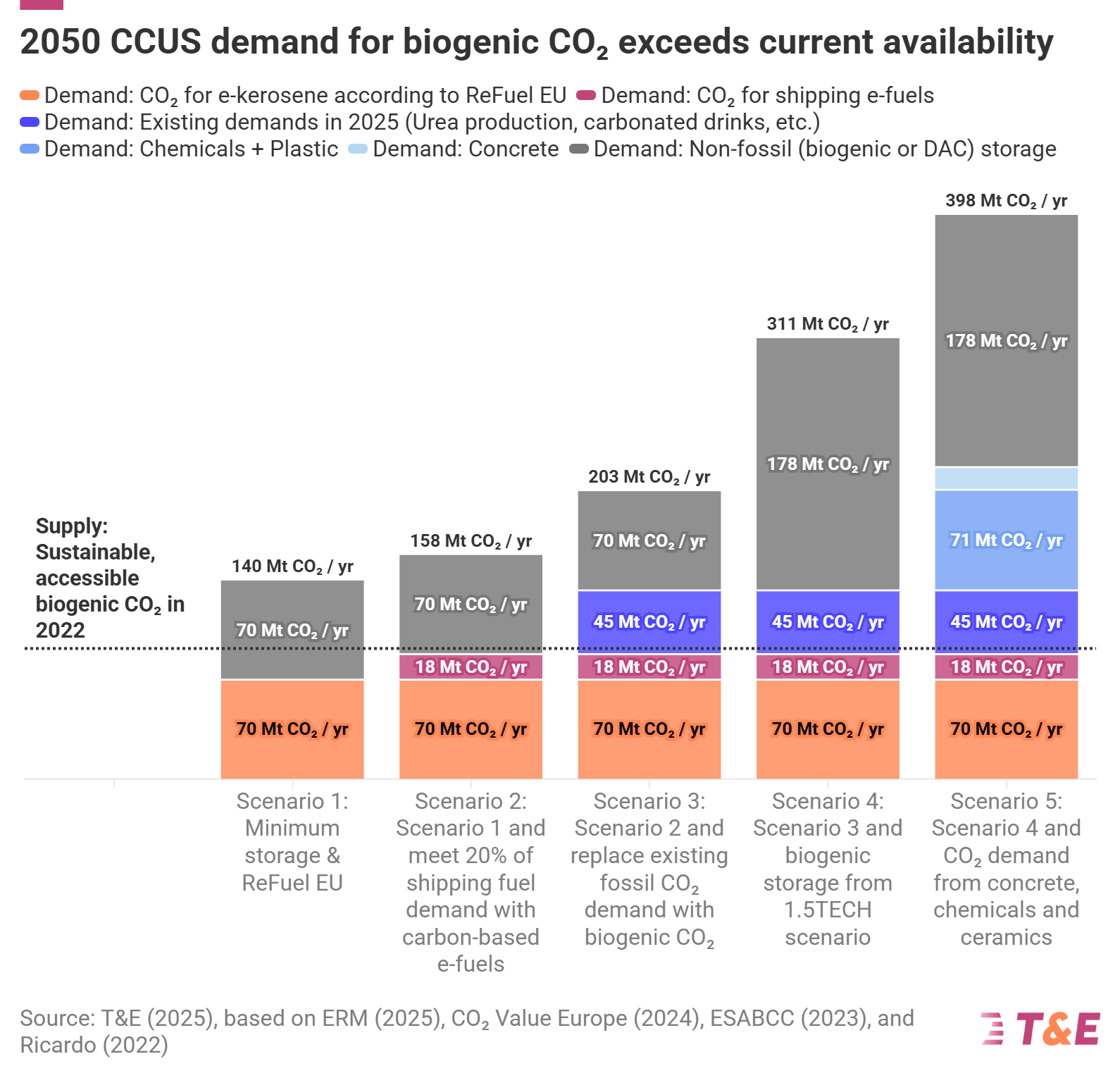 However e-fuels will not be the one sector in search of biogenic CO?. The identical carbon streams are being focused by everlasting carbon storage initiatives, particularly Bioenergy with Carbon Seize and Storage (BECCS), in addition to different CCU makes use of in chemical substances, plastics and concrete. By 2050, mixed CCUS demand for biogenic CO? may rise effectively past right this moment’s 92 Mt of sustainable, accessible provide, that means not everybody will get the carbon they want. With sustainable biogenic CO? each restricted and more and more contested, T&E argues that the EU ought to prioritise its utilization and therefore, cease selling BECCS based mostly on burning biomass for energy and as a substitute be sure these scarce carbon sources go to sustainable makes use of like e-fuels manufacturing.