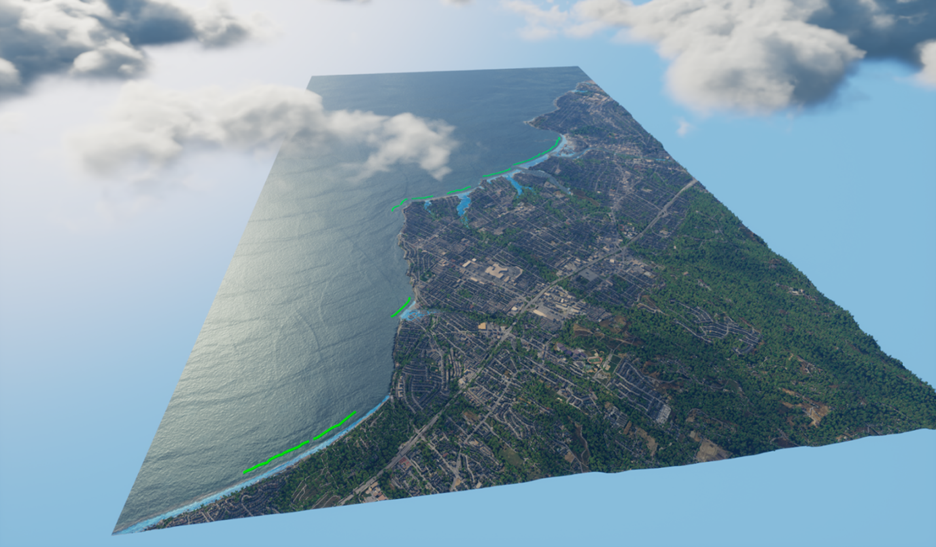 Picture of a 2D flood mannequin of Santa Cruz, California, rendered in Unreal Engine 5 and pixel streamed as an interactive utility.