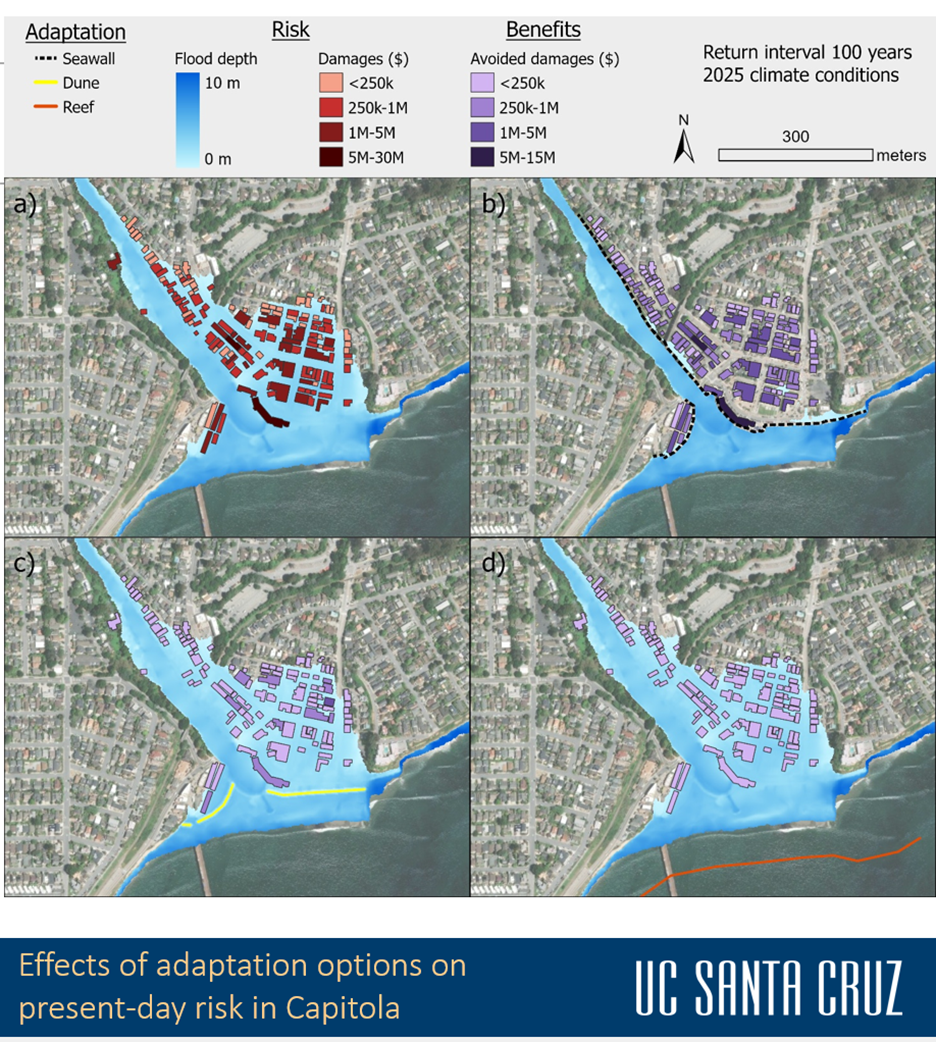 Advantages of adaptation methods in Capitola, California. The picture reveals flood hazard maps which can be used to calculate dangers and property-level financial advantages from adaptation methods to extend safety advantages utilizing seawalls or restored dunes and nearshore rocky reefs. Outcomes from California fifth Local weather Evaluation (in evaluate).